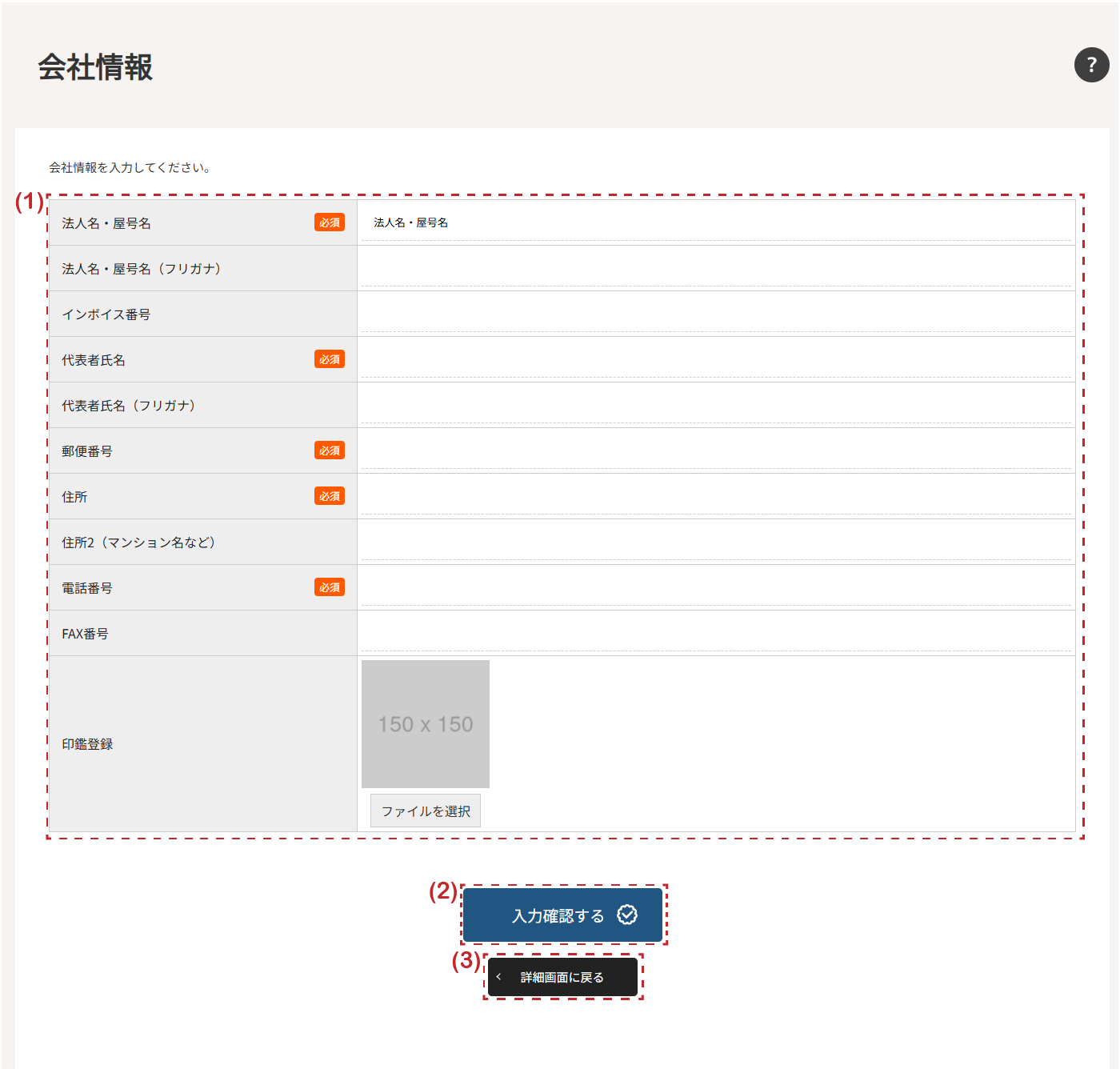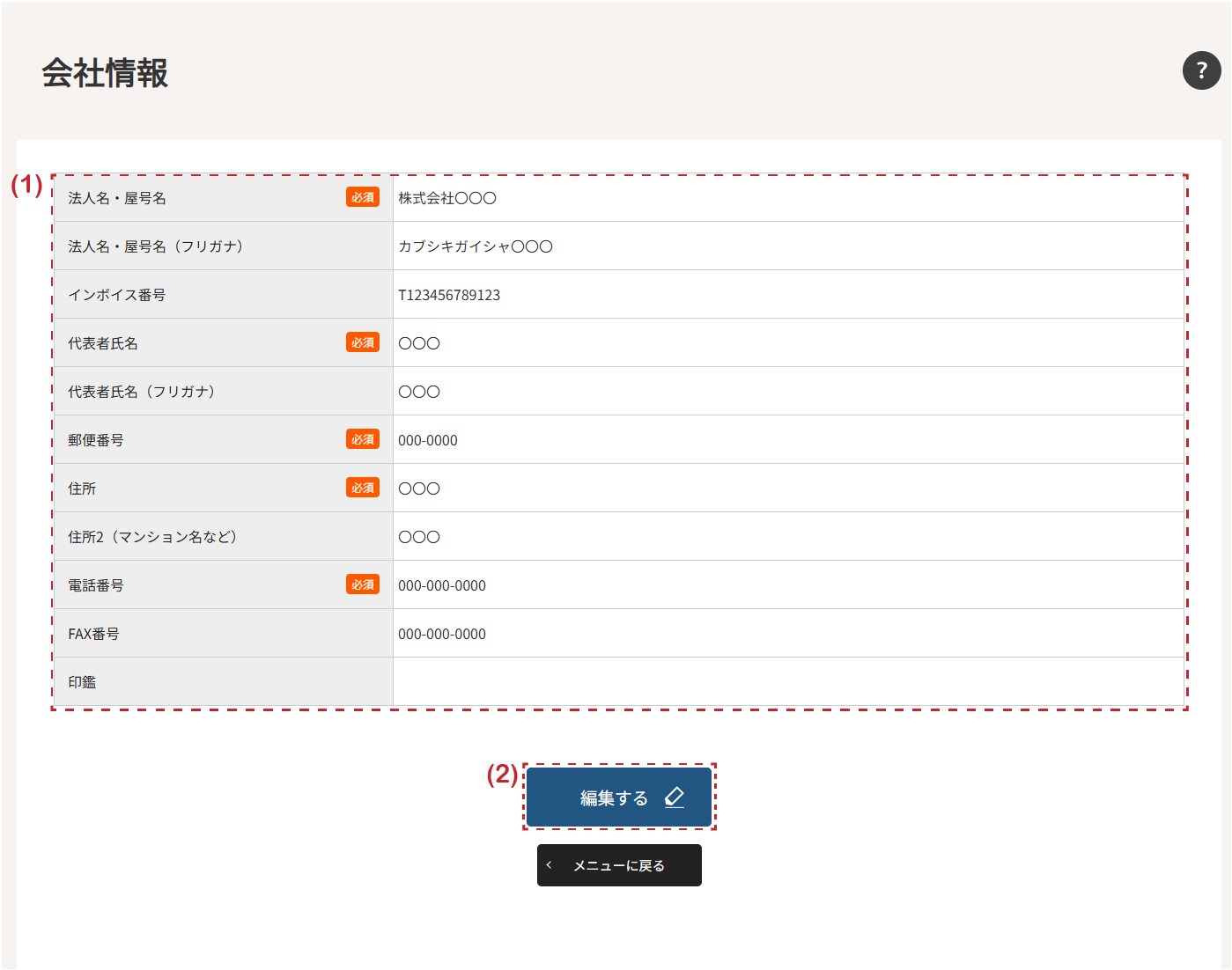 | (1)会社情報 | 会社情報(法人名・屋号名、インボイス番号、代表者氏名、郵便番号、住所、電話番号、FAX番号、印鑑画像)を確認できます。 |