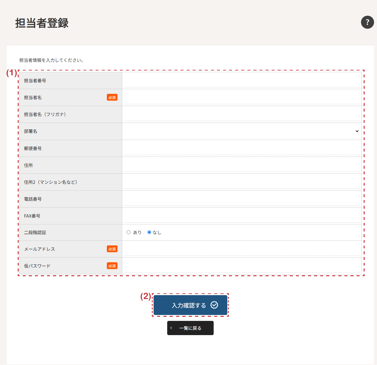 | (1)担当者情報 | 担当者情報(担当者番号・担当者名、部署名、郵便番号、住所、電話番号、FAX番号、メールアドレス、パスワード)を入力できます。 二段階認証の有無を設定できます。 |