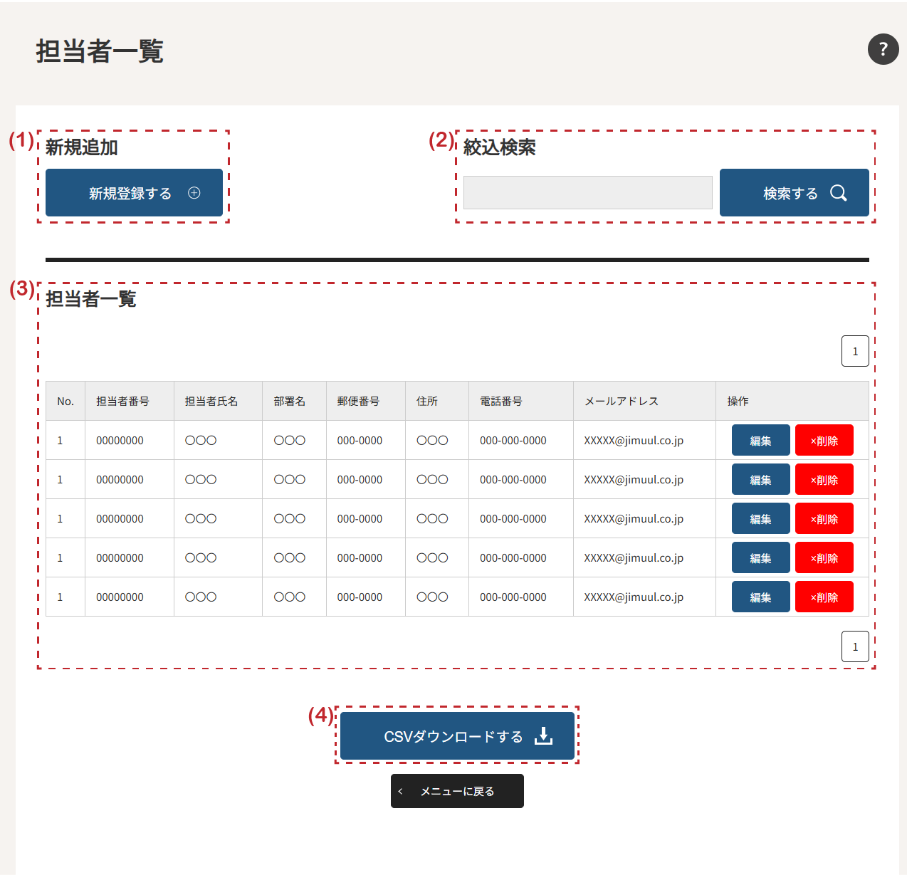 絞り込み検索機能で、特定の担当者に絞り込んで表示できます。 絞り込みたい担当者の、担当者番号・担当者氏名・部署名・郵便番号・住所・電話番号・メールアドレスなどを入力し、検索ボタンを押すと、【(3)担当者一覧】に反映されます。 |
