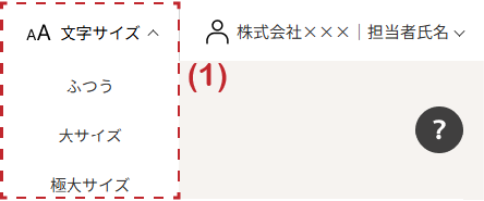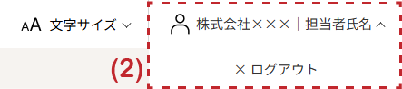 | (2)アカウントメニュー | ログインしている会社名、担当者氏名が表示されます。 ログアウトで、本システムの利用を終了することができます。 |