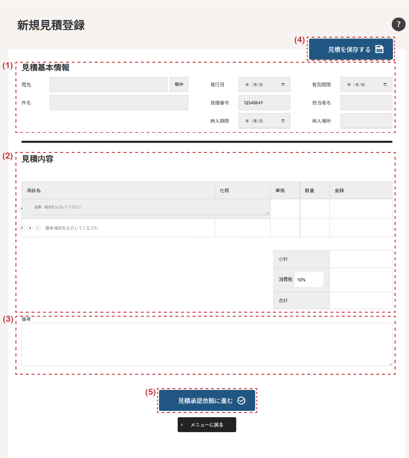 | (5)単価 | 単価を入力できます。 【(3)基本項目】の入力欄で、登録済の基本項目を選択すると、自動で単価が入力されます。 |