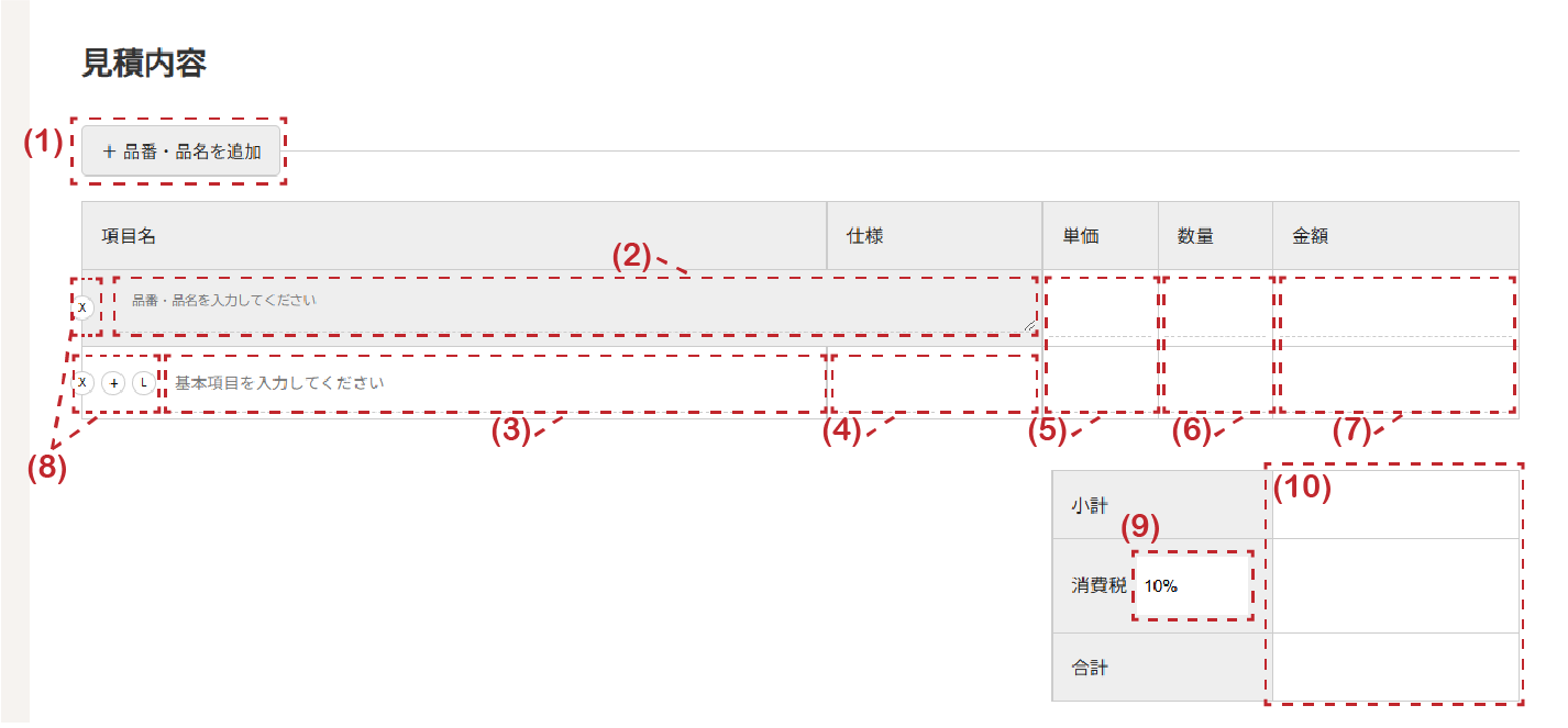 | (10)小計、消費税、合計 | 自動で金額が入力されます。 |